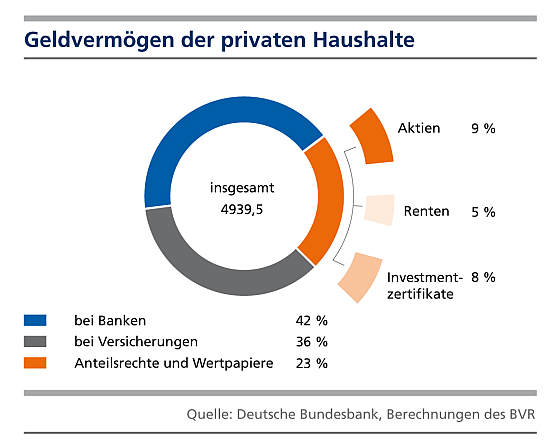 Das Vermögen der deutschen Haushalte ist wiederum gestiegen. Wie sich das Geldvermögen aufteilt, zeigt die Grafik. (Quelle: BVR)