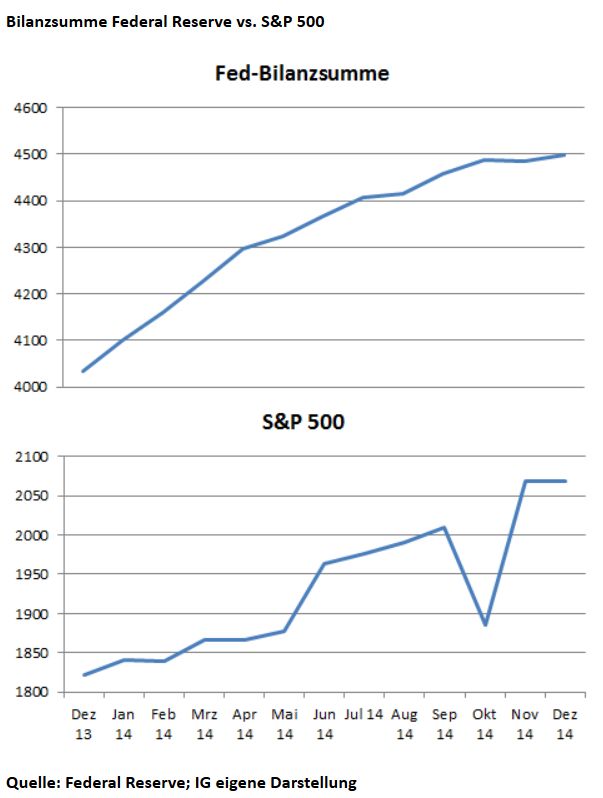 Von einer solchen geldpolitischen Maßnahme konnten die Investoren in den USA profitieren. Die durch Staatsanleihekäufe freigesetzte Liquidität hatte die Notierungen an der Wall Street deutlich angeschoben. Mit einer Ausnahme im Oktober des vergangenen Jahres stiegen die Aktienkurse jenseits des Atlantiks mit der Ausweitung der Bilanzsumme der US-Notenbank Fed. Die Investoren in Europa erhoffen sich eine ähnliche Entwicklung, wenn die EZB die Geldschleusen öffnet und Liquidität in die Finanzmärkte pumpt.