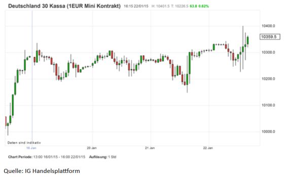 Kurz nach der Bekanntgabe der Öffnung der Geldschleusen sprang der DAX-Motor an. Kurzzeitig näherte sich der deutsche Leitindex der Marke bei 10.400 Zählern. Zur Stunde notiert das heimische Börsenbarometer mit 10.359 Punkten um 0,6% höher. Des einen Freud ist des anderen Leid. Gleichzeitig verlor der EUR-USD weiter an Wert. Momentan tendiert das Währungspaar in Richtung des bisherigen Verlaufstiefs bei 1,1460 USD. Im Aufwind befindet sich der Goldpreis. Das Edelmetall nähert sich jedoch einem Kreuzwiderstand bei 1.298/1.306 USD je Feinunze.