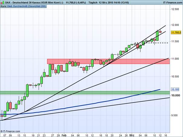 Dennoch streben die deutschen und europäischen Aktien weiter aufwärts in immer höhere Kursgefilde. Doch damit steigt auch die Gefahr einer deutlichen Konsolidierung. Aus diesem Grund wäre ein Kursrückgang bis zur weit entfernten ehemaligen Widerstandsbarriere bei 11.022/10.846 Punkten keine Überraschung. Allerdings liegen zuvor im Tageschart die steile Aufwärtstrendlinie bei momentan 11.700 Zählern sowie die Unterstützung bei 10.454/10.467 Punkten.